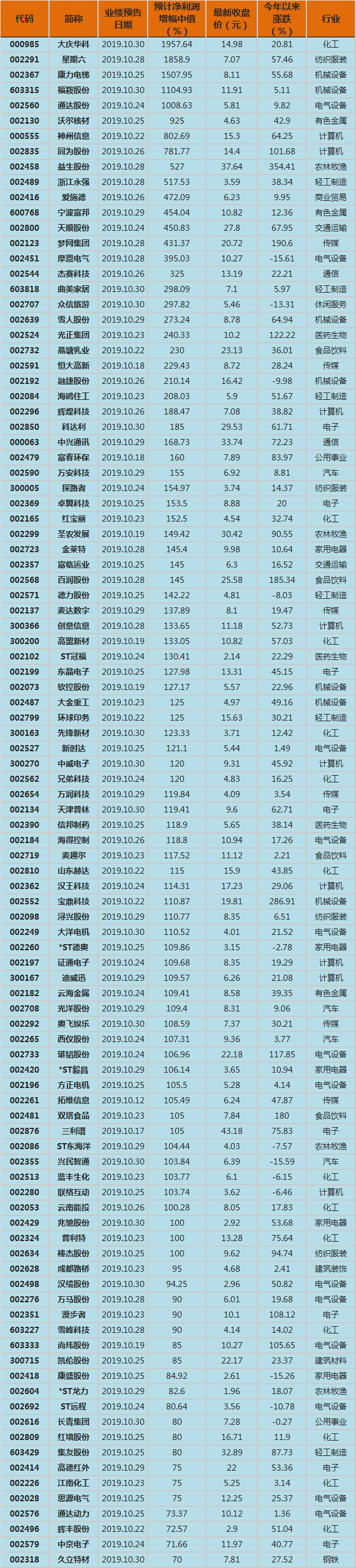 业绩预喜公司中,以预计净利润增幅中值统计,共有80家公司净利润增幅超100%;净利润增幅在50%~100%之间的有45家。具体到个股看,大庆华科预计净利润增幅最高。公司预计全年实现净利润增幅中值为1957.64%;星期六、康力电梯预计全年净利润同比增幅中值分别为1858.90%、1507.95%,增幅位列第二、第三。