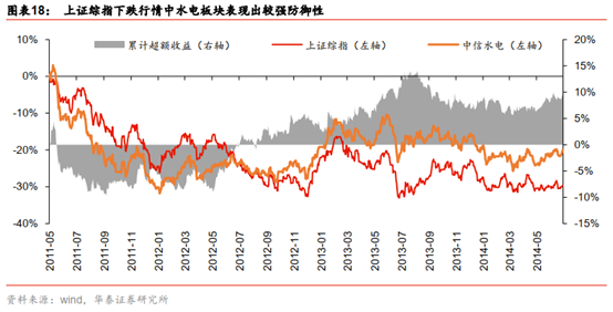 水电作为我国典型的公用事业股票,凭借其类债券属性在2020年有望展现防御价值。历史复盘来看,水电板块在2008年我国经济下行阶段、2011年-2014年上证综指下跌阶段抗跌属性突出,均有较好表现。其中,2008年水电板块超额收益更是高达29%。