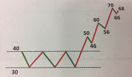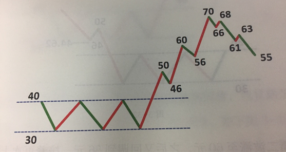 破前低法应用于上涨趋势中的行情。常见的上涨形态如上图所示,具体表现为下一个波浪高点超过上一个波浪高点,同时下一个波浪低点也高于上一个波浪低点。如图所示,新一轮上涨的高点60超过前高50,新一轮上涨的低点56也高于前低46。此时当股价在右侧有效突破40的颈线时,我们可以入场,当股价涨到50,回落到46后开启第二波上涨,46作为第一轮上涨的低点,可以视为止盈标杆,实际操作中,我们将股价跌破46以下3%视为有效跌破,则止盈点设在46*(1-3%)=44.62元,预期收益率(44.62/40)-1=11.55 %。