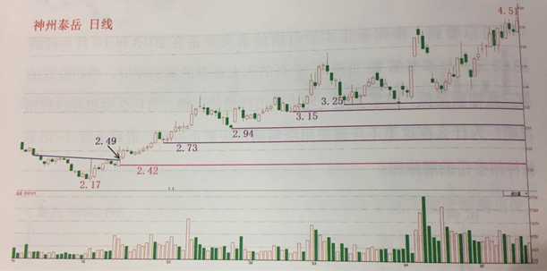 从日线看,神州泰岳构筑了长达一个月的头肩底,并于12月13日以爆量阳线向上突破,突破价位为2.49元,可以在该位置买入。此后股价一路向上,并且每一轮上涨中的低点都高于前低,因此我们可以不用着急止盈,由于前期股价已经下跌了80%多,未来持续上涨的概率非常高。即便在最近一轮上涨中股价的低点打回前低3.15元,但当天收了一个十字星,说明多方力量仍然强势,果然两个交易日后收了两根光头大阳线,后来股价虽向下补跌,但在达到前低之后迅速反弹回升,此时价位距离我们2.49元的买点已经有30%多的收益了,价格安全,无需仓促止盈。