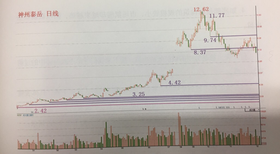 再往后看,神州泰岳股价持续攀升,至最高点12.62元已经距我们的建仓点2.49元上涨了4倍多。当然要在最高点止盈的概率是很低的。后期我们可以看到股票已经进入下跌趋势,每一波的高点都低于前高,我们可以选择在第二轮下跌中打到前低的9.74元为止盈基准,止盈点设在9.74*(1-3%)=9.45的位置,也能盈利280%。