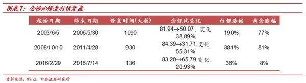3、历史可鉴,金银比修复在20%以上,板块内白银具备明显的超额收益。2000年至今共发了三次金银比的修复行情:1)2003年6月5日至2006年5月30日,修复周期为1090天,金银比由81.94下修至50.07,变化38.89,期间黄金价格上涨77%,白银价格上涨190%;2)2008年10月10日-2011年4月28日,修复周期为930天,金银比由84.39下修至31.71,变化55.31%,期间黄金价格上涨81%,白银价格上涨381%;3)最近的一次,2016年2月29日-2016年7月14日,修复周期为136天,金银比由83.20下修至65.79,变化20.93%,期间黄金价格上涨8%,白银上涨36%。