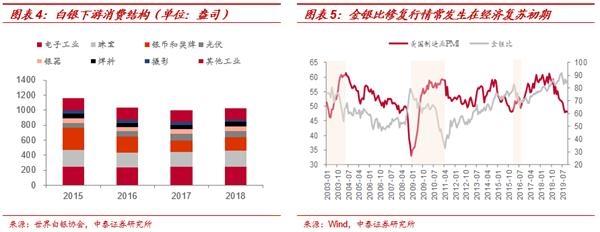2、更进一步,白银兼具金融与商品双重属性,商品属性是金银比修复的核心推动力,因此金银比修复常出现在经济复苏初期。白银具有良好的延展性、导电性和热导率,因此银在制造业中广泛应用,其使用领域包括工业应用、摄影、首饰制造、银器、制币及奖章等领域。传统白银消费领域珠宝首饰、铸币需求呈下降趋势,但随着电子工业的高速发展,以及光伏、新能源等新兴行业的兴起,金属银在工业应用方面的需求有望保持较高水平。正是由于银的商品属性,金银比的修复行情常出现在经济复苏初期,我们复盘了近三轮金银比修复行情,每一轮金银比的向下修复都伴随着经济的企稳回升(美国制造业PMI参照)。