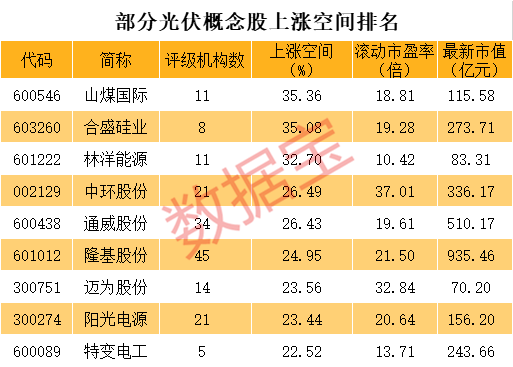 数据宝统计了太阳能概念、多晶硅概念,发现有15只机构关注度较高的股票一致上涨空间超过20%。粗略筛选后,合计有9只概念较纯正的股票进入榜单。其中,11家机构评级的山煤国际,一致目标价上涨空间超过35%居首,公司与钧石能源合作,拟共同建设总规模10GW 的异质结电池生产线项目。