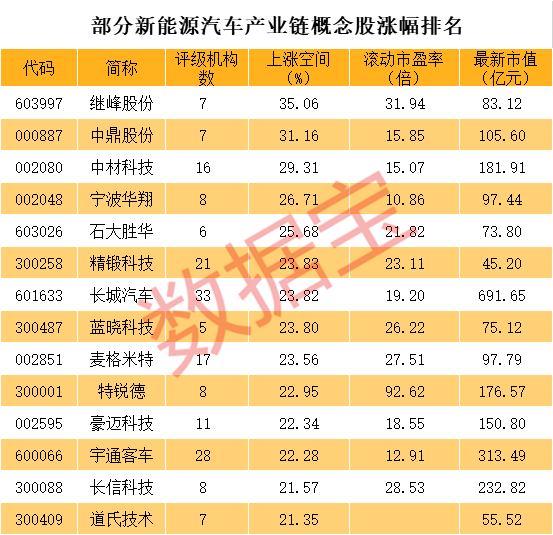 证券时报·数据宝统计了新能源汽车概念、特斯拉概念及锂电池概念,发现有20多只机构关注度较高的股票一致上涨空间超过20%。粗略筛选后,合计有15只概念较纯正的股票进入榜单。其中,7家机构评级的继峰股份,一致目标价上涨空间超过35%居首。
