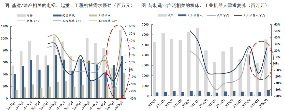 Q2电梯、起重、工程机械行业增速分别为14%、12%和45%,需求强劲。基础制造相关的机床、工业机器人Q2增速分别+16%、+25%。这些行业的增长来自更广泛的制造业普遍进入复苏周期,预计未来2-3年持续稳健增长。