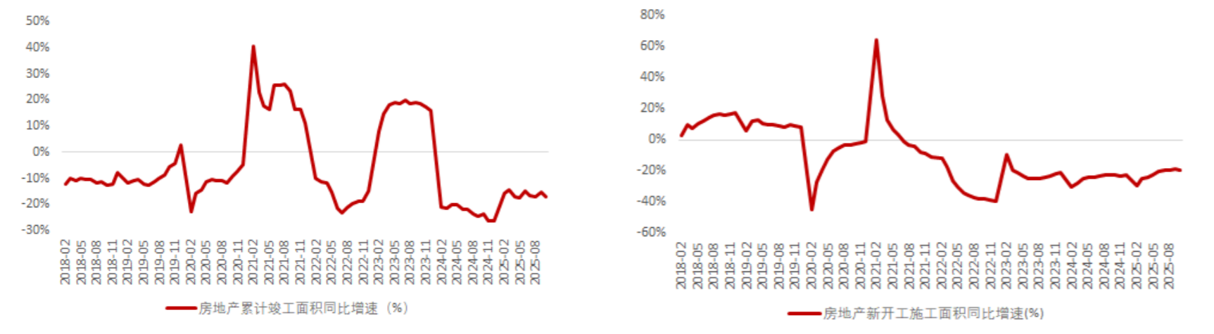 图:房地产累计竣工面积及增速(左),房地产新开工施工面积及增速(右),单位:% |