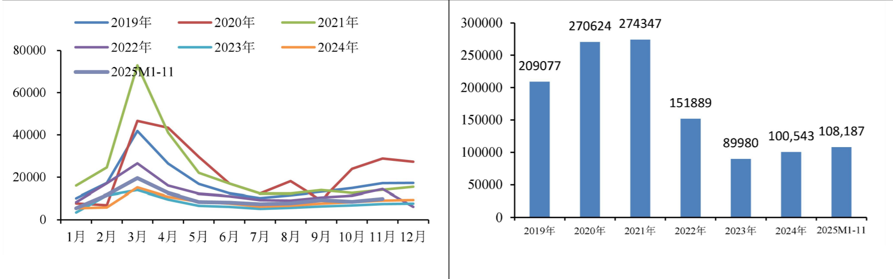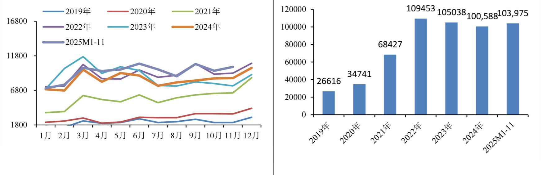 图:2019-2025M1-11 我国挖机月度内销销量(左),2019-2025M1-11 我国挖机内销累计销量(右),单位:台 |