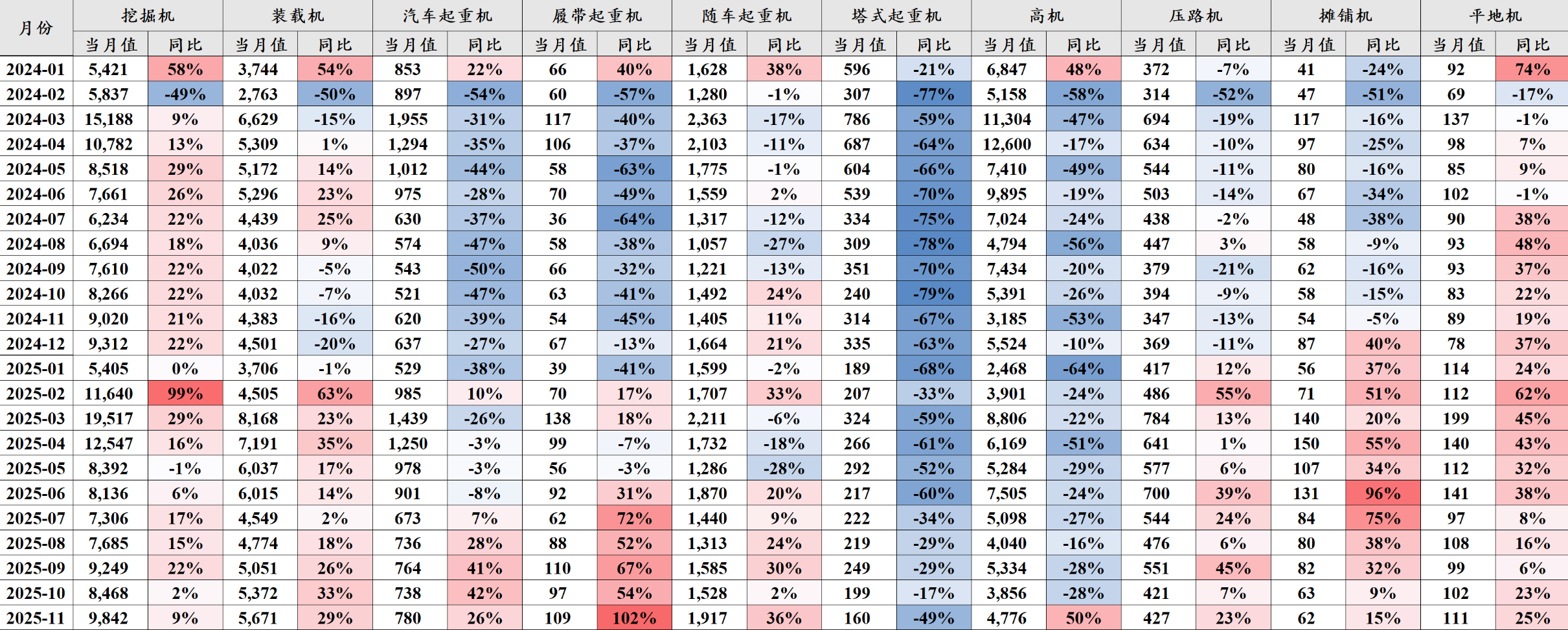 履带起重机:2025年11月当月销售各类履带起重机329台,同比增长66.2%,其中国内销量109台,同比增长102%;出口量220台,同比增长52.8%。