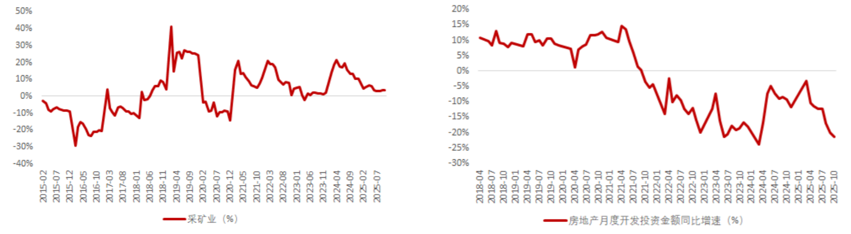 图:采矿业固定资产投资累计同比(左),房地产月度开发投资金额同比增速(右),单位:% |
