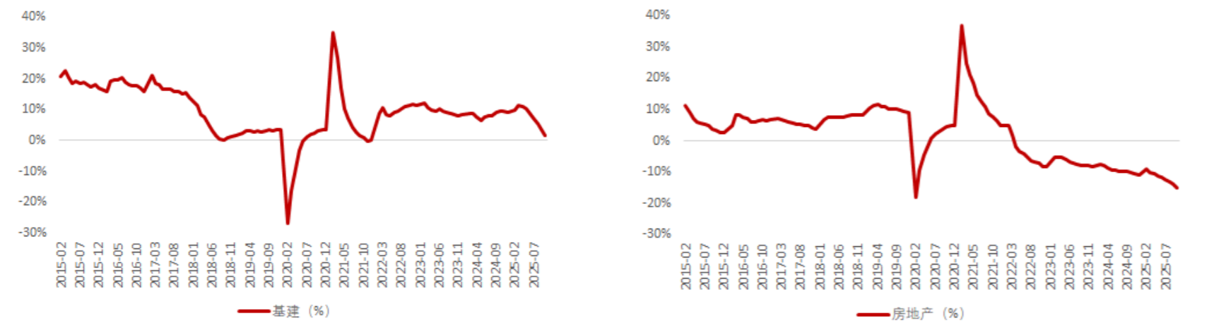 图:基建固定资产投资累计同比(左),房地产固定资产投资累计同比(右),单位:% |