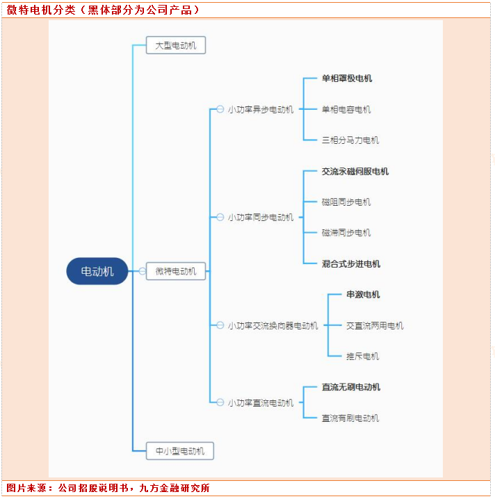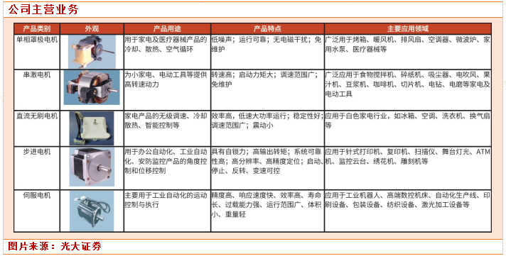 公司从事微特电机的开发、生产与销售。主要产品包括单相罩极电机(含贯流风机)、串激电机、步进电机、直流无刷电机。按应用领域分类可分为智能家居类产品、健康与护理类产品和运动控制类产品。
