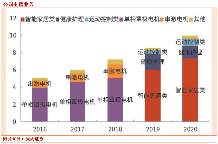 随着新产品开发,公司产品结构不断优化。公司于2019 年调整了分部业务划分方法,由按产品分类改为按应用领域分类。总体来看,目前以单相罩极电机和串激电机为代表的,主要面向智能家居和健康护理领域的产品营收占比接近90%。2020年,以伺服电机和步进电机为代表的运动控制类产品初步实现放量,营收占比从2019年的5%提升至2020 年的9%。