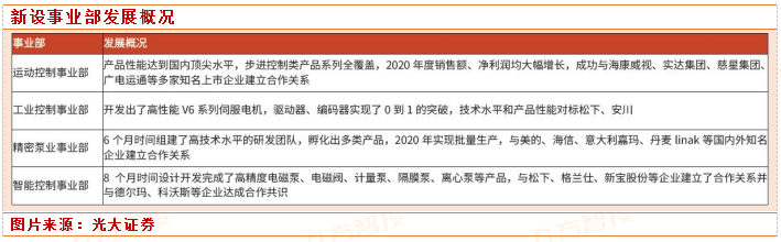 公司陆续新设运动控制事业部、工业控制事业部、精密泵业事业部、智能控制事业部,并取得新业务快速发展。运动控制事业部实现步进控制类产品系列全覆盖,2020 年步进电机营业收入同比增长83.42%,成功与海康威视、实达集团、慈星集团、广电运通等多家知名上市企业建立合作关系;工业控制事业部开发出了高性能V6 系列伺服电机,驱动器、编码器实现了0 到1 的突破,技术水平和产品性能对标松下、安川。