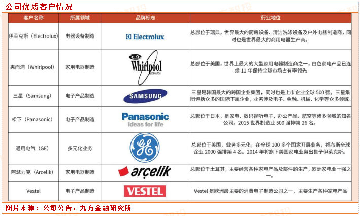 公司凭借优异的产品品质和优质的服务成为伊莱克斯(Electrolux)、惠而浦(Whirlpool)、通用电气(GE)、阿瑟力克(Arcelik)、松下(Panasonic)、美的、海信、海康威视、广电运通等国内外知名家电企业的重要供应商。