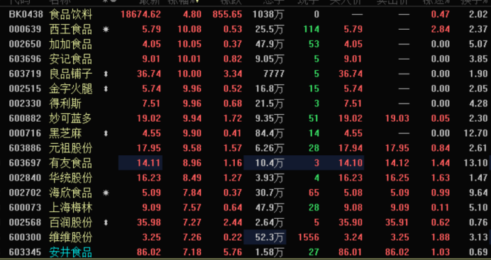 备受疫情打击的食品饮料板块今天迎来了属于自己的高光时刻,市场表现碾压近期热门的科技行业。截至发稿,西王食品、加加食品、良品铺子等多只个股涨停。板块涨幅接近5%,全板块仅有一只个股未翻红。