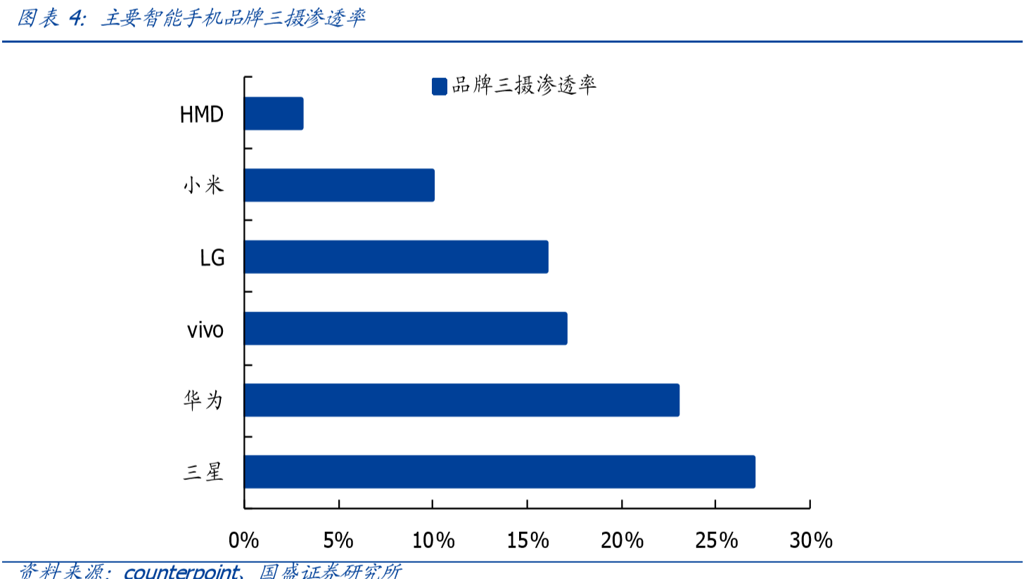 随着三星S10+的发布,智能手机前臵双摄设臵正式登上舞台,随后国内主流品牌陆续跟进,我们认为2020年多摄潜力也将释放。从整体数据来看,市场中三摄手机目前渗透率为15%,在2020年末将达到35%、2021年突破50%。