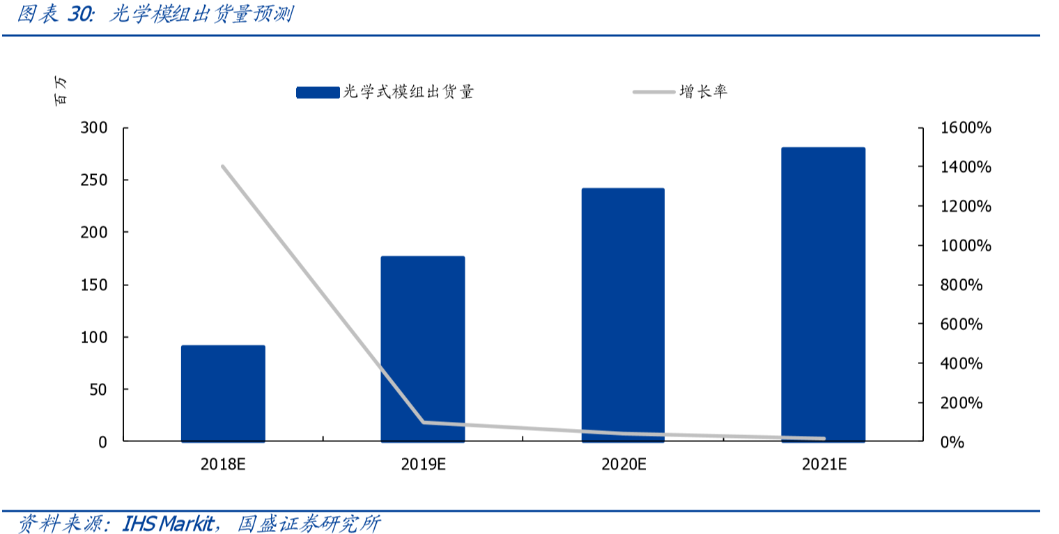 根据IHSMarkit数据预测,2018光学式指纹识别模组的出货量将预计超过9000万颗;2019年继续保持高速增长,出货量预计将超过1.75亿颗;至2021年预计将超过2.8亿颗。