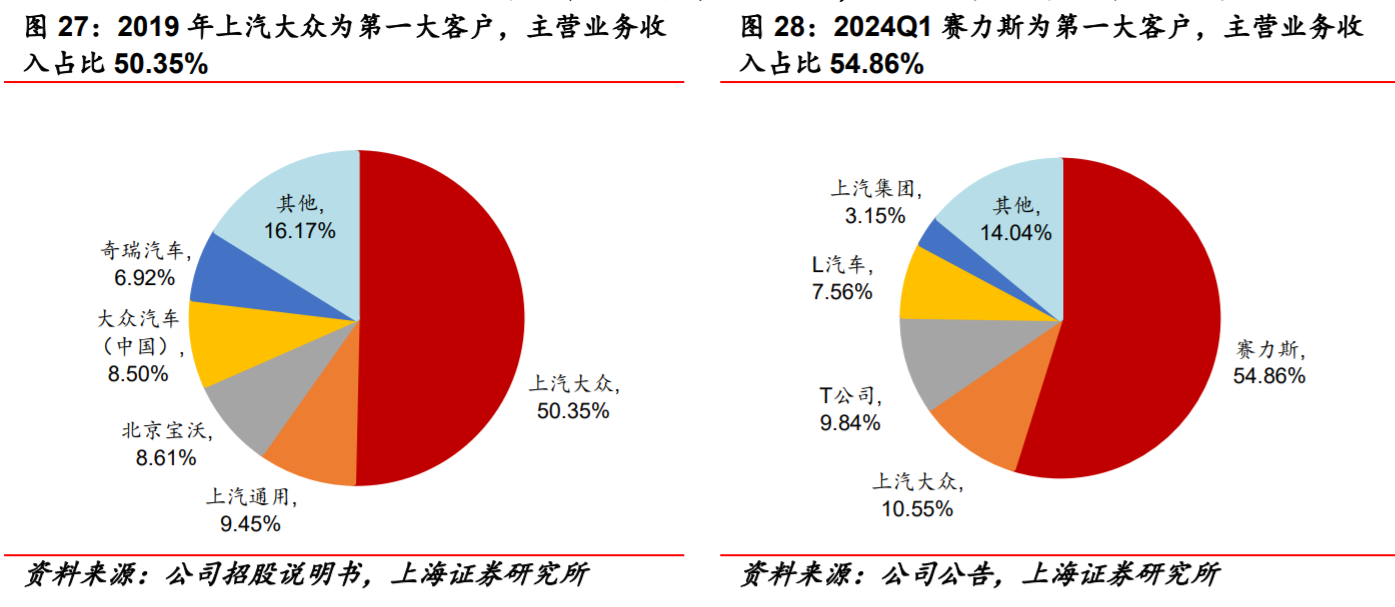 客户结构:公司客户结构持续优化,已从上市前高度依赖上汽大众(2019年占比>50%)转变为深度绑定头部新势力。2024年,第一大客户为赛力斯,销售额占比高达52.84%;其他前五大客户为上汽大众、理想汽车(6.5%)、特斯拉(6%)、上汽通用。