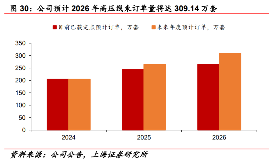 项目订单充足。根据公司公告,截至2024年6月,公司已获定点项目预计2024~2026年高压线束订单量分别为204.64万套、243.79万套和264.30万套。根据公司对未来年度增量订单的测算,预计2026年订单量将达309.14万套。