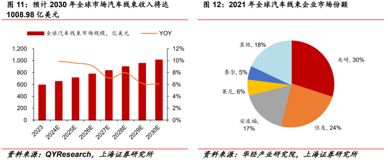 市场空间广阔:汽车电动化与智能化是线束行业增长的核心驱动力。高压线束成为新能源车的刚需,单车价值量从传统燃油车的2,000-4,000元提升至新能源车的5,000元以上。随着800V高压架构和高阶智能驾驶的渗透,高速线束、轻量化铝线束等新技术的应用将进一步推高单车价值。据测算,2030年国内汽车线束市场规模预计将超过1200亿元,较2024年有约270亿元的增量空间。