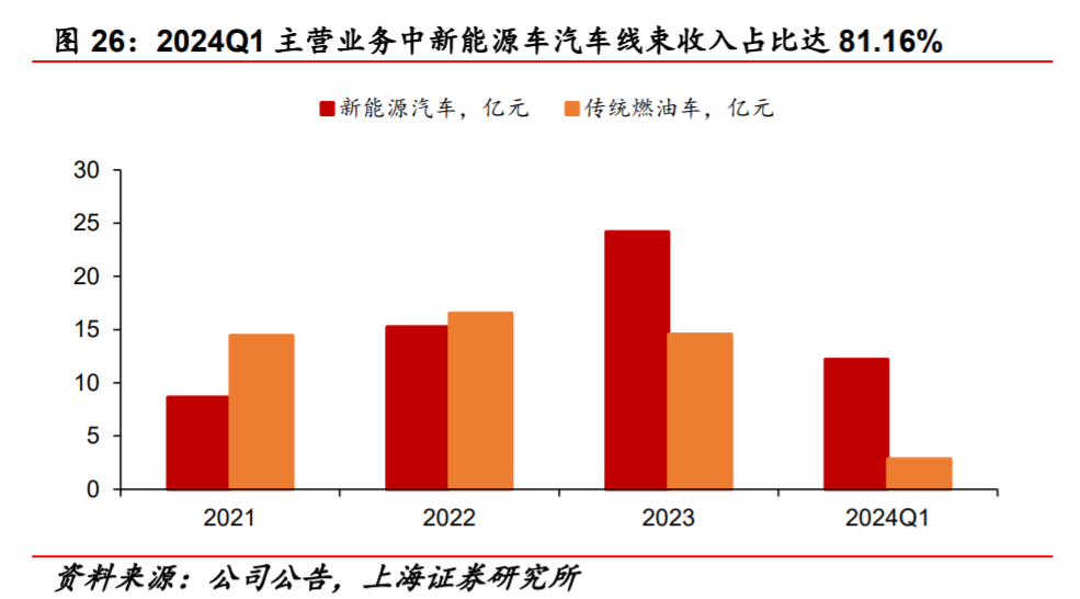 发动机线束:主要为传统燃油车配套,随着新能源汽车渗透率提升,该业务收入和占比呈下降趋势,2024年收入占比已不足3%。