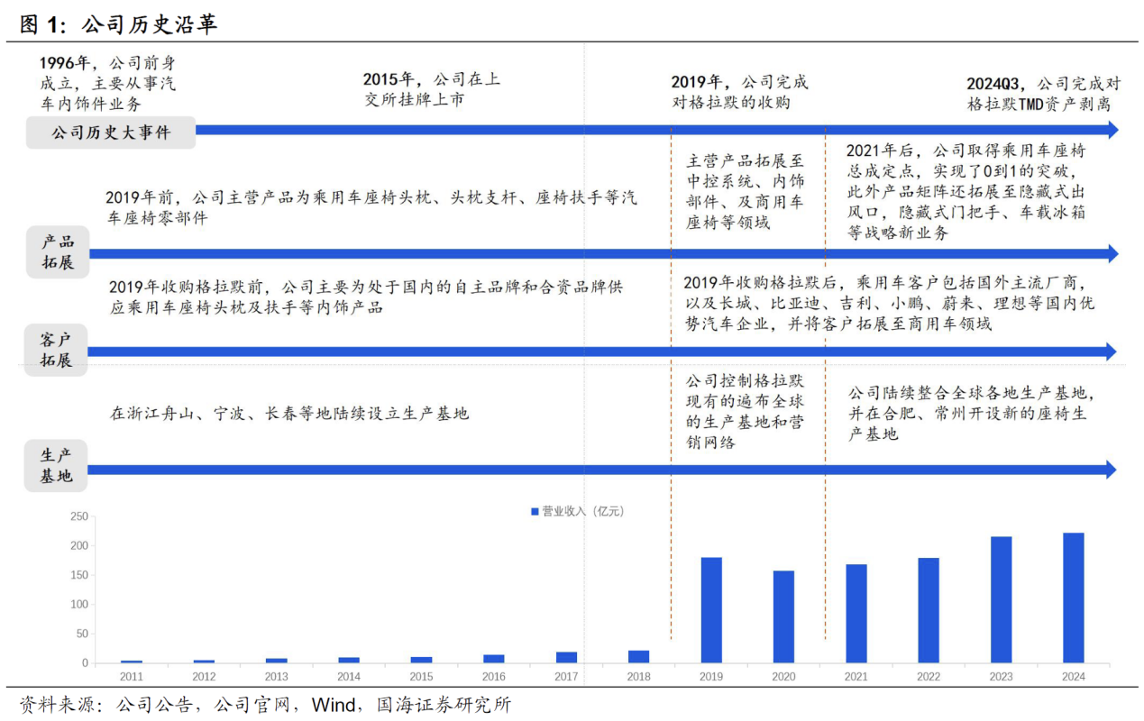 1)1996年~2018年:奠定基石业务。此期间公司专注头枕、扶手等汽车座椅零部件产品,并于2015年在上交所挂牌上市;