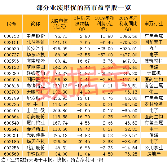 在这48只高市盈率且北上资金抛售的股票中,10股去年净利润预亏,其中华东科技预亏金额最高。华东科技表示,2019年度面板市场产需不平衡,面板价格持续下跌,其中占公司主要产能的55"TV 面板产品价格最大跌幅超过30%,公司预计去年净利润亏损56亿元至57亿元。除亏损股外,寒锐钴业、天赐材料、华友钴业、罗牛山、士兰微、哈药股份等股预计去年净利润同比下滑50%以上。