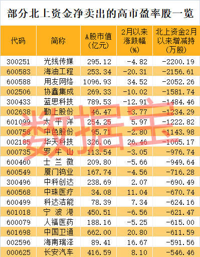 证券时报·数据宝统计显示,滚动市盈率在百倍以上或因累计净利润为负值无法计算市盈率的股票,共计千只以上。这千只股票中,共有48只春节以来遭北上资金净卖出百万股以上。数据显示,北上资金净卖出股数最高的是光线传媒,春节以来净卖出2200万股,该股北上资金持仓市值降至4.21亿元。北上资金净卖出逾千万股的还有海油工程、用友网络、协鑫集成、蓝思科技、勤上股份等。具体名单见下表: