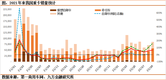 然而,着眼主要细分类型销量,年内支撑重卡行业景气回归的主要驱动并非地产基建,而更可能是基于消费的经济复苏。行业细分数据显示,我国重型自卸卡车占重卡整体销量的比重自2022年跳水腰斩以来绝大多数月份都维持在5%以下;国内对于重型自卸车辆的需求力度持续疲弱。与此形成鲜明对比的是,同期的牵引车/卡车的销量比重不仅均值达到了47.96%,还在2023年内快速上升至9月份的68.03%。可以说,与物流运输关联更加紧密的重型牵引车已经成为推动我国重卡行业景气回归的绝对主力。