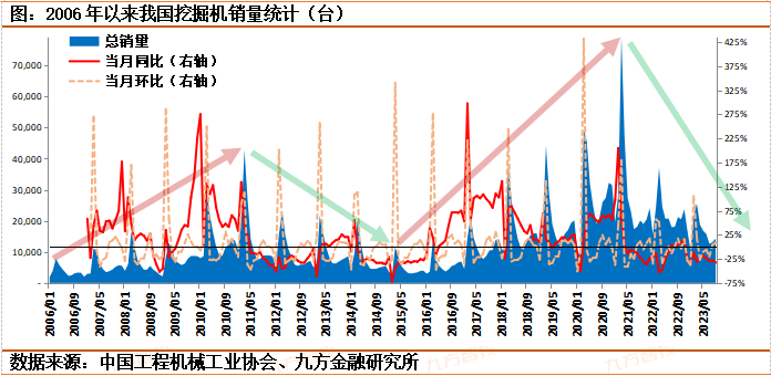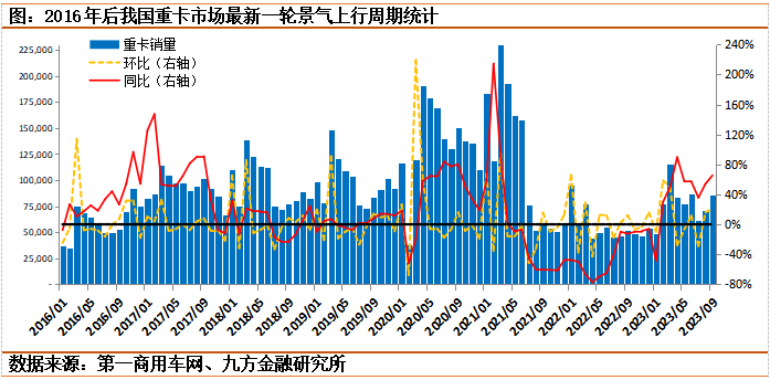 重卡年内销售数据显著好转的表现是支撑工程机械行业景气预期情绪的另一重要因素;毕竟截至2021年的历史高点前,我国重卡行业的总体表现与工程机械行业高度趋同。根据行业数据,我国重卡市场自2006年以后同样呈现出明显的5年周期规律特征,截至目前的最新一轮景气上行周期也出现在2015-2016年销量见底之后。所以,我国1-9月重卡累计销量仍强于2016年的表现叠加年内重卡月销量同比“八连涨”的情况,对于当前市场围绕景气成长周期的乐观预期情绪构成了直接支撑。