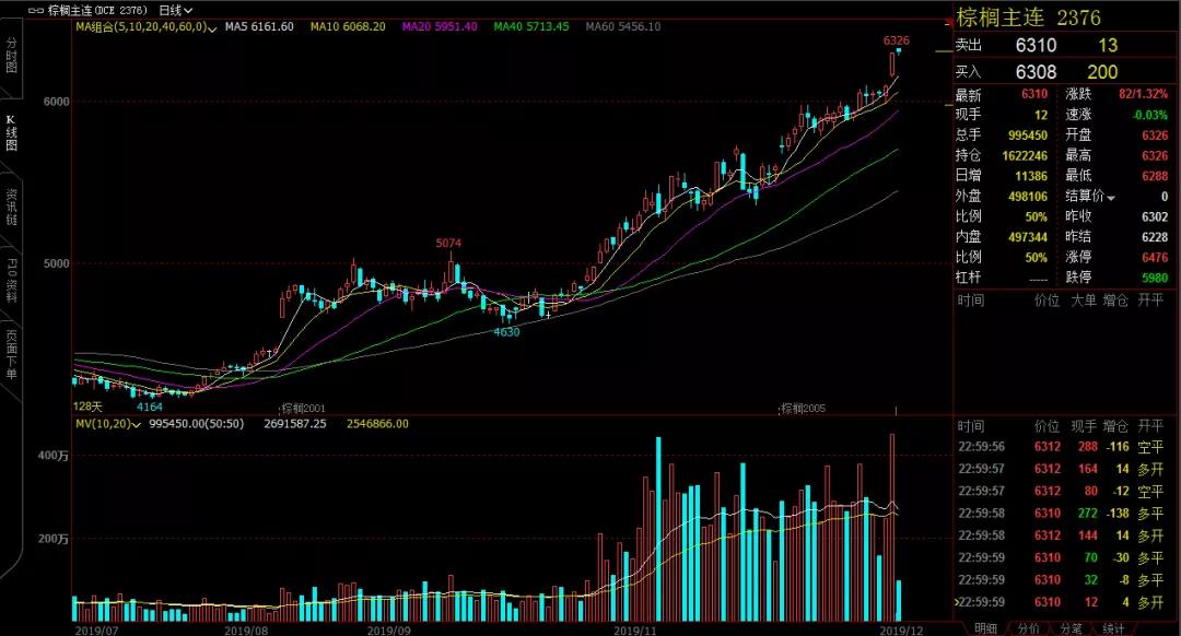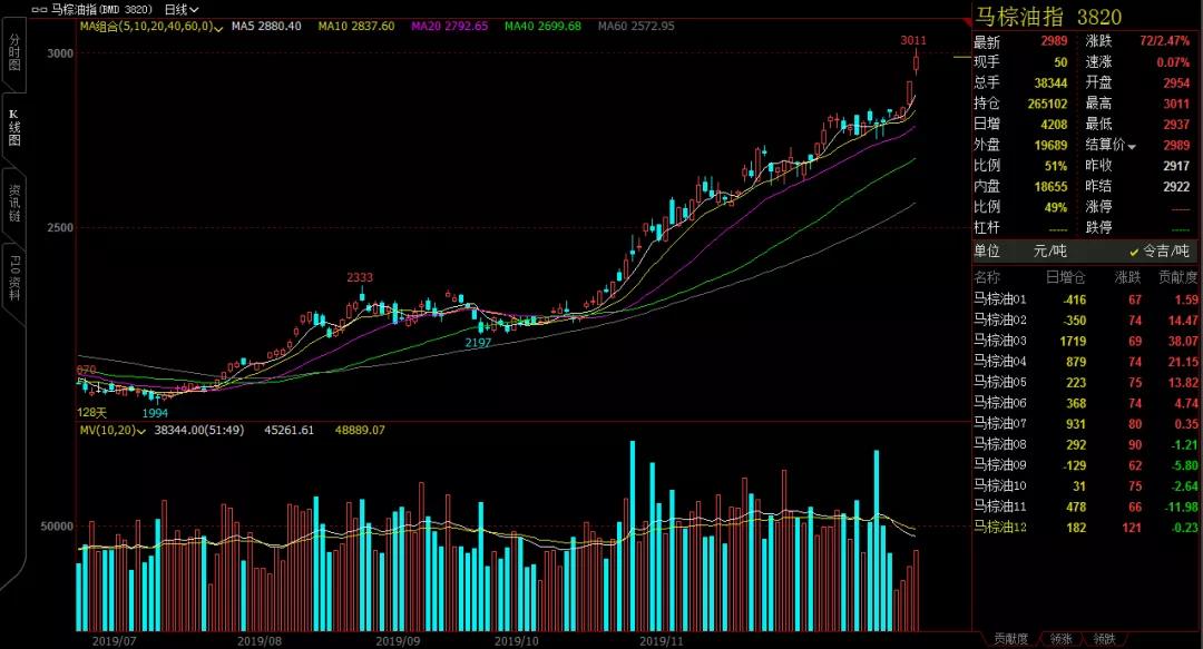 2019年的最后几个交易日,商品市场里的油脂板块表现不俗。尤其领涨的棕榈油期货,在外盘带动下,近期连续上扬,上周五更是放量大涨,大有掀起跨年行情的势头,大部分专家继续看涨棕榈油,建议关注棕榈油期货和相关投资机会。