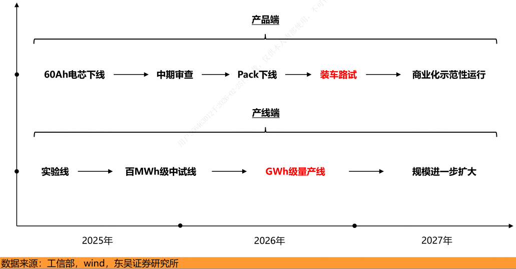 产业节奏符合2025年车规级电芯下线+中试线建成,2026年Pack下线+样车路试+量产线建成,2027年小规模量产+装车示范运营的预期。