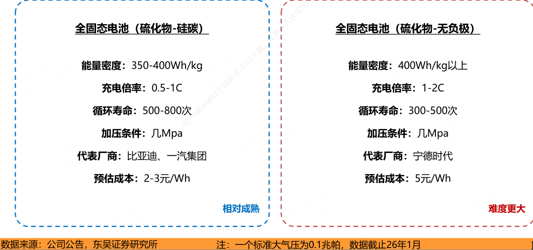 从中期审查结果看,2026年初全固态电池能量密度已达400Wh/kg水平,充电倍率可达1C水平,基本完成此前固态专项要求,但循环寿命指标仍有待突破,硫化物-硅碳路线循环寿命约500-800次,硫化物-无负极路线循环寿命约300-500次,较此前固态专项要求(1000次)仍有部分差距,随着材料、设备和电芯端的持续优化,预计2026年固态电池的循环寿命问题有望实现突破。