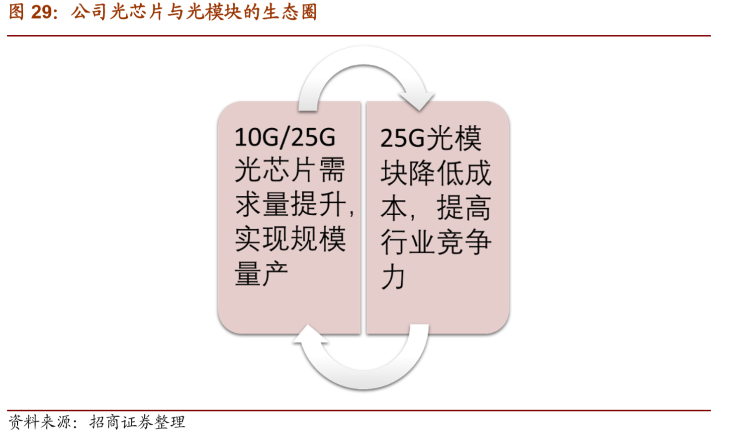 目前,公司具备批量生产10G光芯片的能力,主要供给自家光模块产品,可以有效降低成本。此外公司25G的DBF和VCSEL已经实现规模量产,25G的EML已经在送样和测试中,有望逐步推出商用。公司25GDFB光芯片已经通过重点客户认证,正逐步在自家光模块产品中进行切换。
