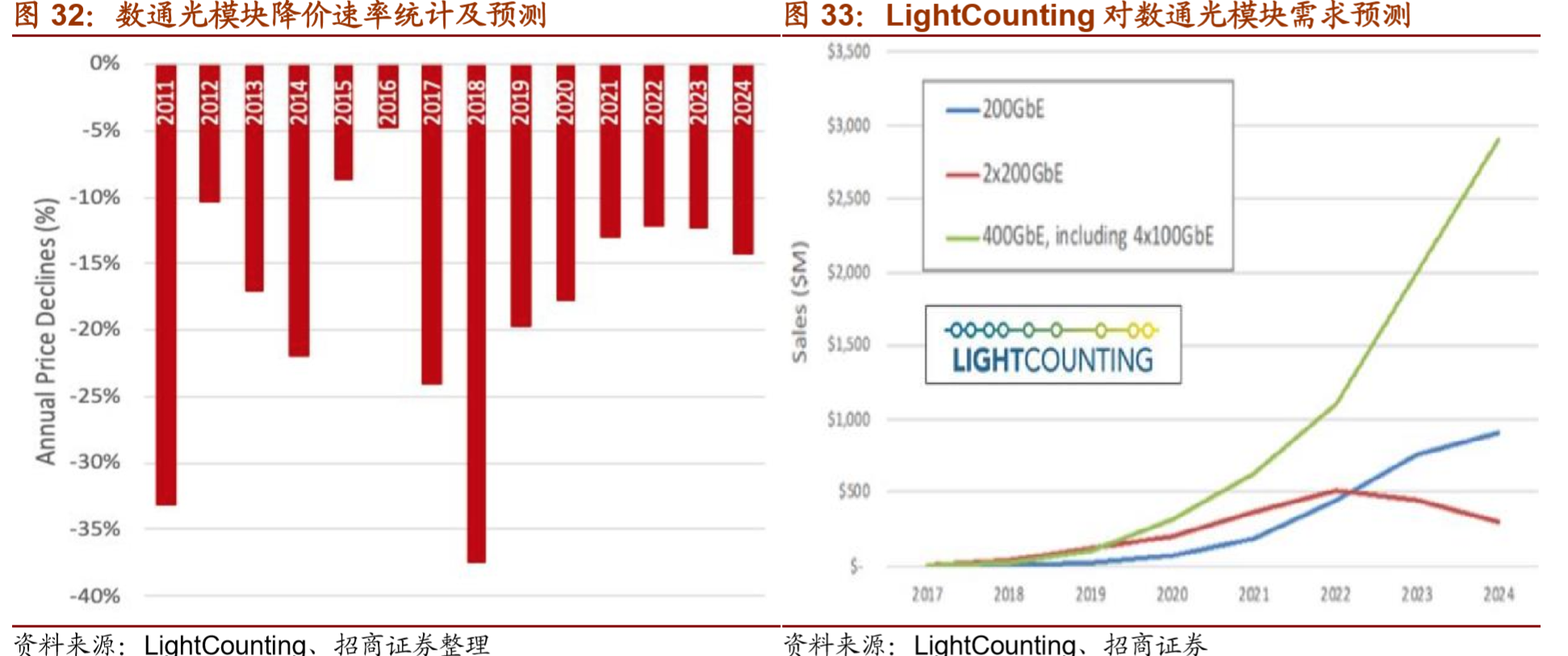 2020年数通市场方面的2x200GbE,4x100GbE以及400GbE等将会逐步上量,相关价格在2019年的降幅明显收窄,预期2020年价格下降幅度将进一步收窄至17.5%左右。