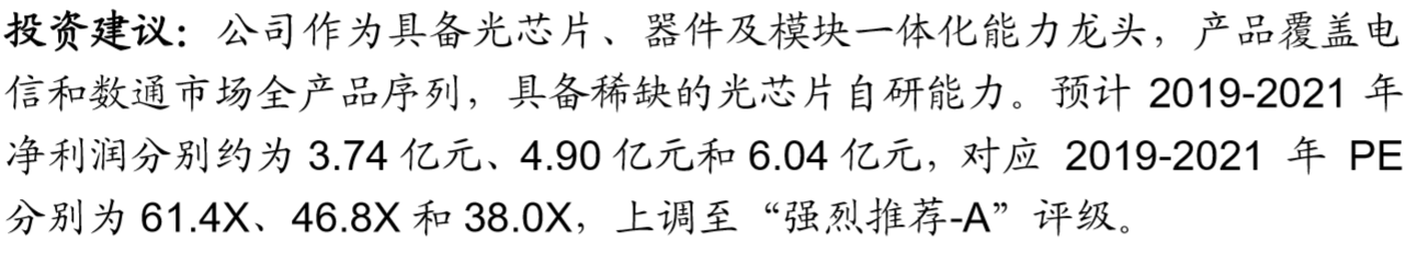 公司已取得国内主要资讯商及设备集成商的数据通信用100G光模块订单,预计2019年包括BAT在内的客户订单需求将超过20万只。