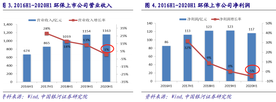 根据银河证券统计的84家环保相关上市公司的业绩表现,2020 上半年,环保相关上市公司营业收入合计1,162.76 亿元,同比增长 0.78%,实现净利润 116.90 亿元,同比减少 4.94%。