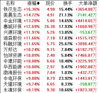 今日环保子版块表现亮眼,环保工程板块涨近4%,垃圾分类板块涨3.23%,固废处理板块涨3.12%,污水处理板块涨3.01%,均位于涨幅榜前列。