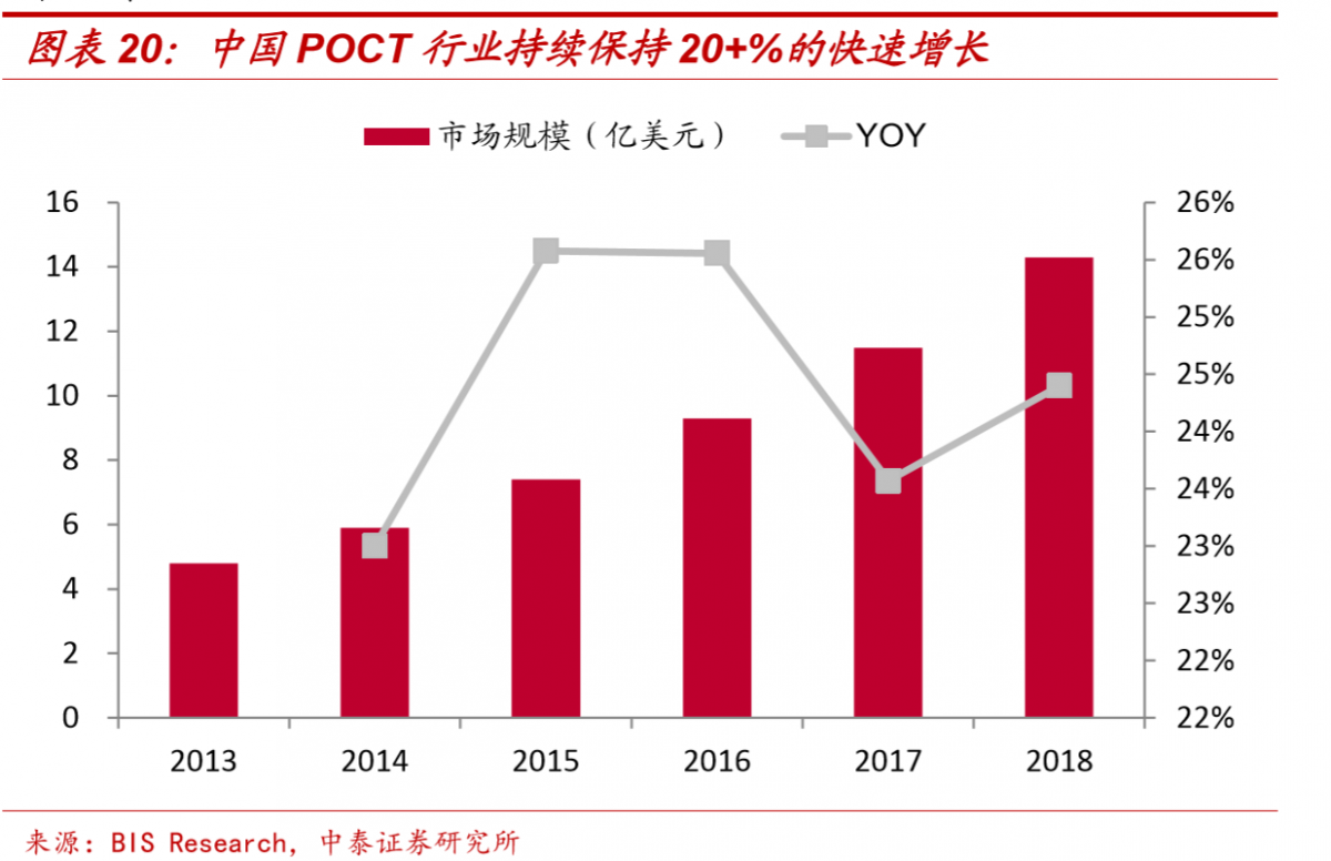 2013-2018年,我国POCT行业CAGR为24.42%,我们认为主要原因来自心理、疾病发展和政策等多方面因素,其中分级诊疗、胸痛中心等五大中心建设等政策实施对POCT的发展带来较大的促进作用。