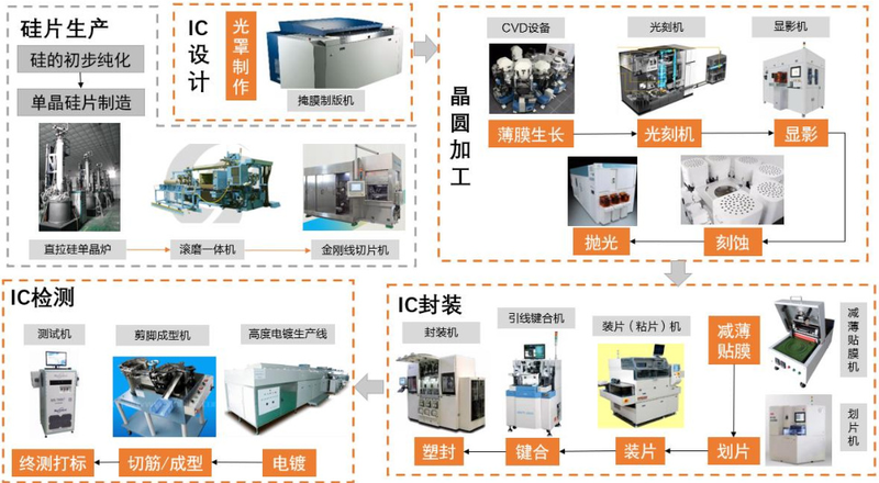 半导体制造环节所需设备:1)生产设计工序:制造光罩的掩膜板制造设备;2)制造工序:光刻机、刻蚀机、离子注入机、涂胶显影机;3)封装段工序:划片机、装片设备、塑封设备;4)检测段工序:电镀机、AOI设备、激光打标机;5)硅片生产加工工序:晶体生长炉、磨圆机、倒角机和抛光机等。