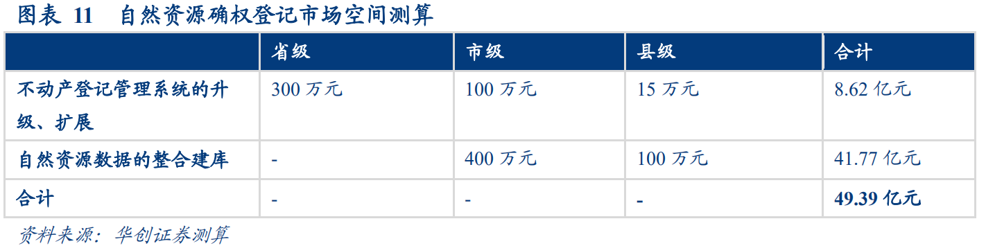除此以外,自然资源确权登记带来的市场主要来自于不动产登记管理系统的升级、扩展及自然资源数据的整合建库,据我们初步测算,自然资源确权登记有望带来近50亿市场。