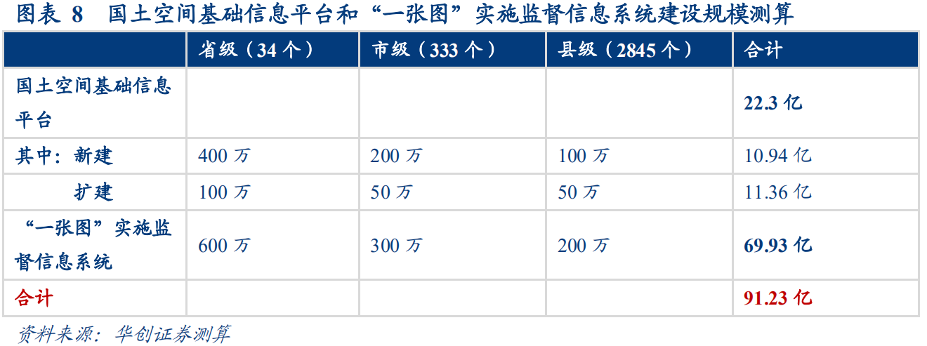 2020年有望成为国土空间基础信息平台和“一张图”实施监督信息系统建设高峰。据我们初步测算,国土空间基础信息平台和“一张图”实施监督信息系统建设有望带来91.23亿元,而且预计国土空间规划“一张图”建设完成后,围绕国土空间信息平台的其他应用系统建设需求也将逐渐增加,市场空间料将超过百亿。