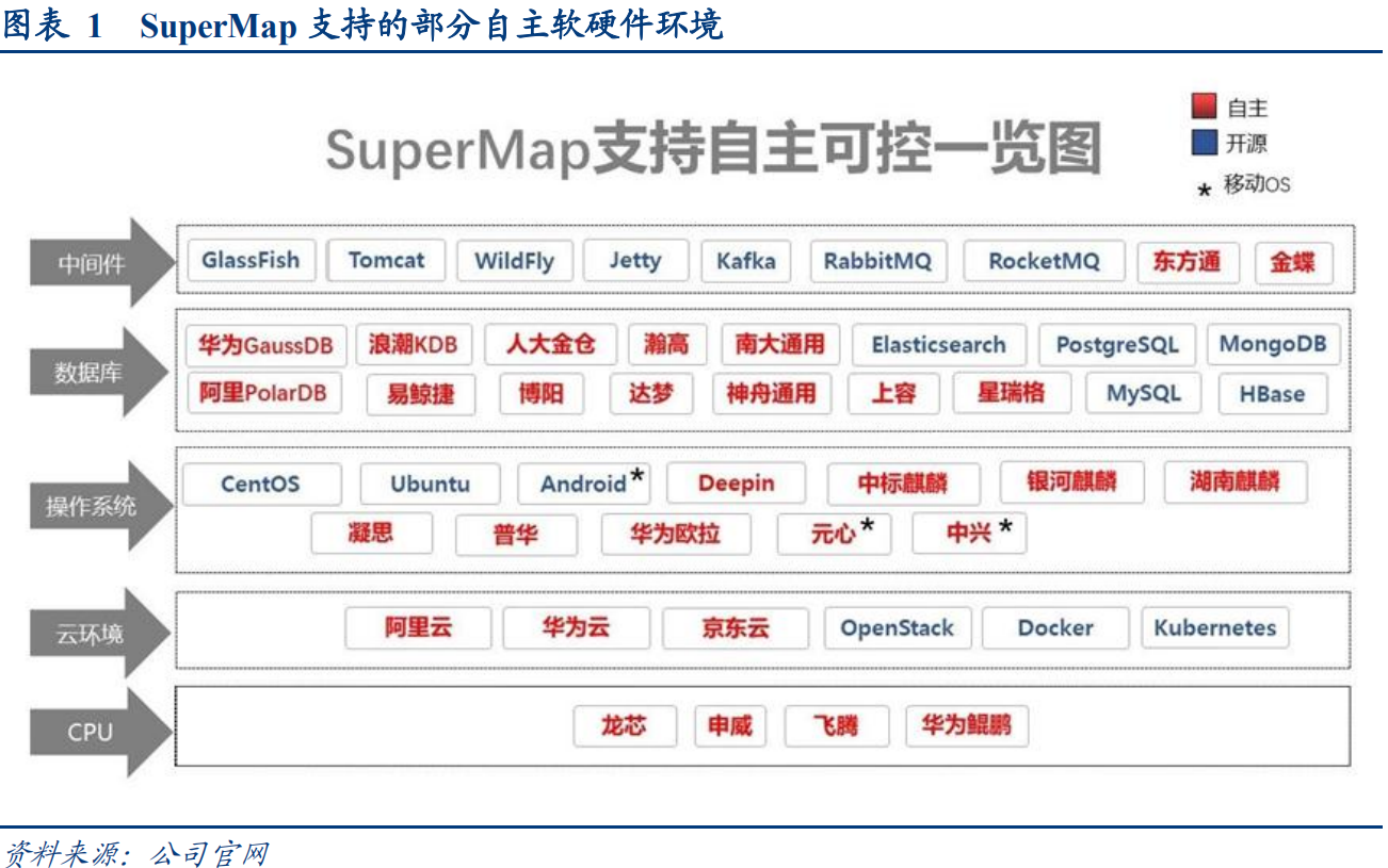 超图软件是国产GIS软件龙头,公司早已实现对龙芯、飞腾和申威等自主CPU的支持,及对多种自主操作系统、数据库和中间件的支持,并通过兼容性测试。公司自2007年起就与华为形成了良好的合作关系,双方合作主要基于基础软件和智慧园区展开,此前双方已合作为廊坊经济技术开发区构建以数据驱动的“智慧大脑”,后续双方在智慧城市、物联网等领域的合作有望继续深入。