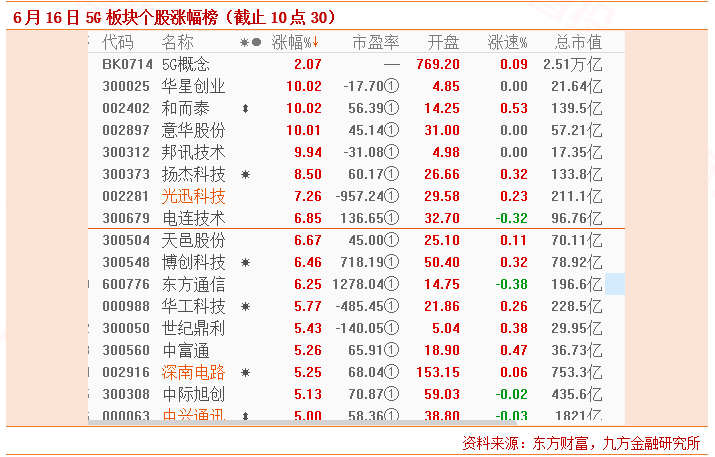 6月16日,沉寂许久的5G板块终于打破宁静,华星创业,和而泰,意华股份,邦讯技术分分涨停,龙头大哥中兴通讯也上涨5%。