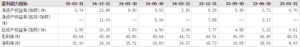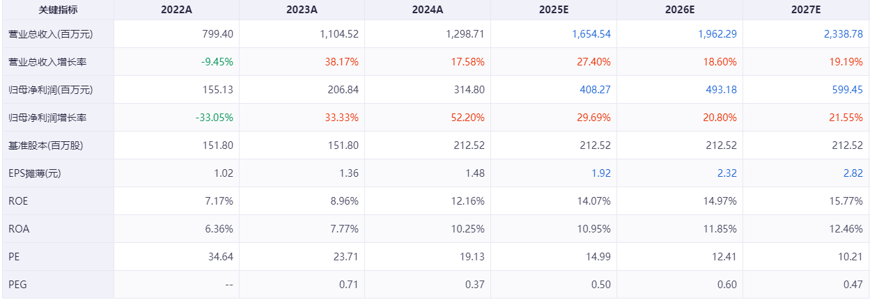 2024年实现营收12.99亿元,同比增长17.58%;归母净利润3.15亿元,同比增长52.20%;扣非归母净利润2.70亿元,同比增长53.10%。盈利能力方面,毛利率45.49%,同比增长0.58pcts,净利率24.24%,同比增长5.51pcts。现金流方面,2024年经营性现金流净额2.80亿元,同比增加184.84%。