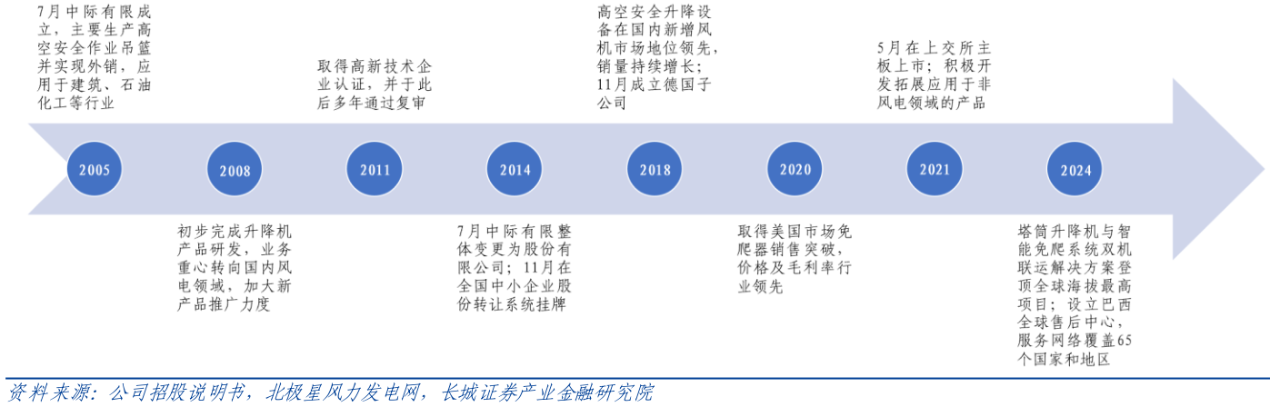初创与专业(2005-2011):公司前身中际有限成立于2005年,初期从事高空安全作业吊篮的生产并销往国外,并抓住国外市场机遇,开始着手研发风电行业专用高空安全升降设备;2008年,金融危机爆发后,公司初步完成升降机产品研发,将业务重心转向国内并扩大推广力度;2011年,公司凭借自主创新形成的多项核心技术取得高新技术企业认证。