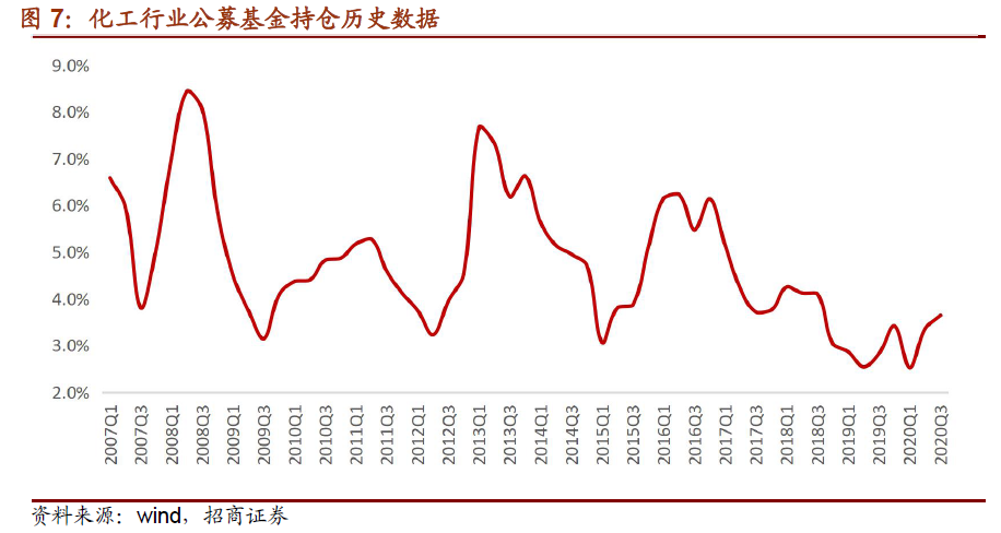 公募基金对化工行业个股的持仓非常具有周期性,在2019 年二季度末和2020 年一季度末达到了历史最低点,只有2.5%。2020 年二季度和三季度,随着国内经济复苏、化工行业景气度提升,公募基金中化工行业持仓比例有所回升,但仍然处于低位。可以预见的是,随着化工股业绩逐步修复以及行情持续展开,公募基金继续增配是大概率。