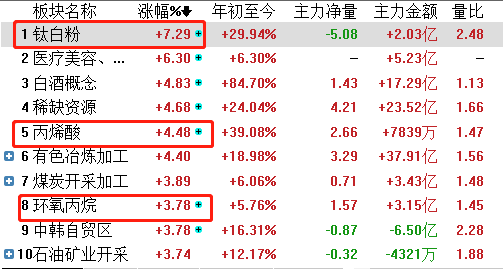 化工板块今日迎来全面爆发,钛白粉、丙烯酸、环氧丙烷、化工新材料、磷化工等多个细分板块指数涨幅均超3%,惠云钛业、金浦钛业、鲁西化工等多股涨停。