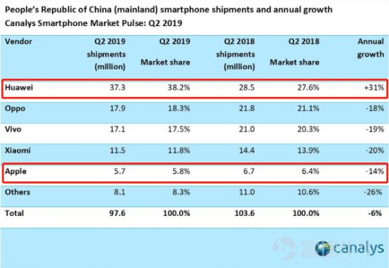 数据分析机构Canalys发布的报告显示,2019年第二季度,中国市场整体下跌6%,出货量连续九个季度下滑至9760万台,但华为第二季度市场份额飙升至38%,出货量达3730万台,同比增长31%,苹果下降14%,出货量仅570万台。